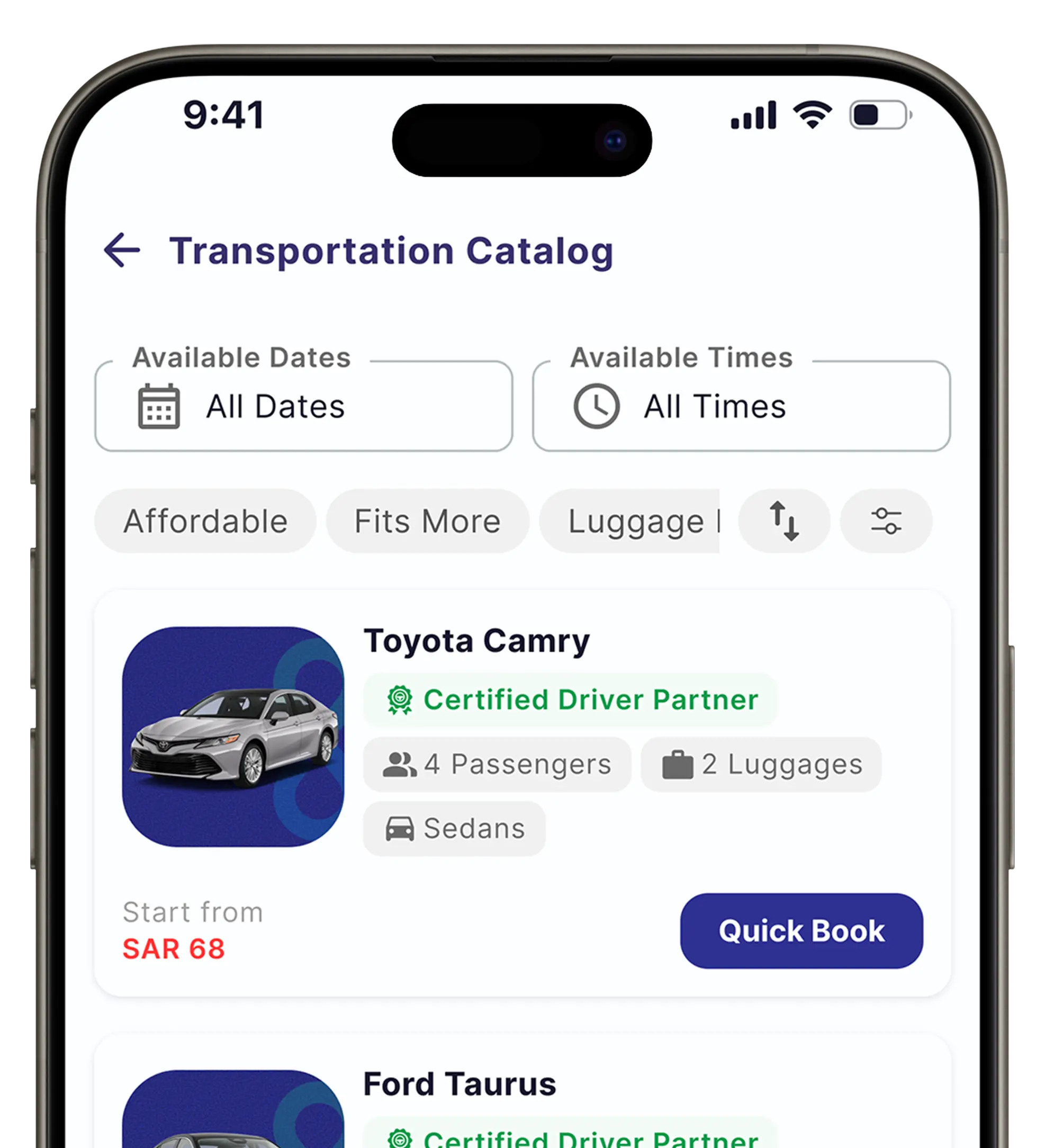 Travel comfortably with our trusted transport partners. Choose your preferred vehicle type and schedule with ease, and move between holy sites with peace of mind.